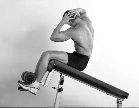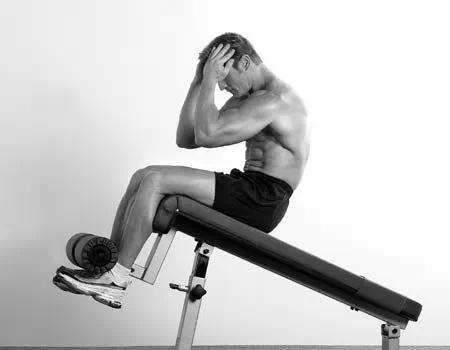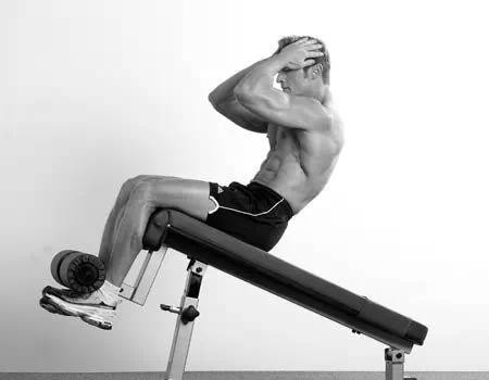 初始姿势:坐在下斜板上,身体后倾约30°,侧面看躯干垂直于板凳表面,将双脚勾在脚垫下,使膝盖弯曲90°左右,双手放在头部两侧,放松颈部。这个动作不是一个全程的仰卧起坐(只是其中的上半段,下斜板上的全程仰卧起坐实际上也是不规范的,虽然很多人都在做)。