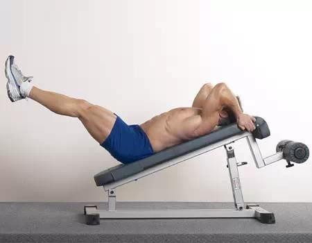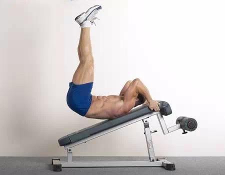 Overview:这是腹肌下侧训练中一个比较容易的动作,但并不意味着它很容易做。当你尽可能有效的孤立腹肌下侧时,它会迅速疲劳。利用这个动作,可以很好的学习如何聚焦腹肌下侧,利用这个动作并得到收益,并且当你无法做难度更大的动作时(如悬垂举腿),可以回到这个动作来。与男性相比,女性通常有更长的腿和更短的上身,因此这个动作对于女性来说就显得容易的多,因此,为了增加难度,建议训练者在斜板上进行训练——让臀部低于胸部以增加重力、阻力和活动范围。(这个动作的极端形式是在一个倾斜度很大的上斜板上,靠在板上,双手握紧扶手,利用卷腹力量把双腿“甩到头顶”,这是发展爆发力,也可以缓缓的举过头顶,难度就更大了,也可以举腿到一定位置后静止,类似李小龙的“升旗(神龙摆尾)”动作)。