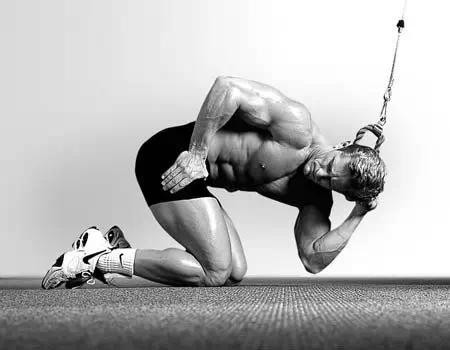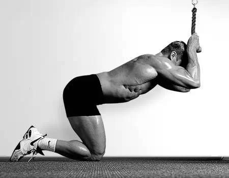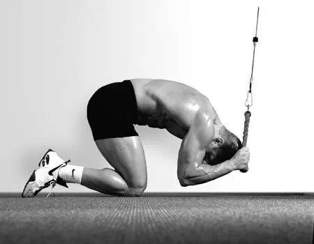 动作过程:保持骨盆和下背部静止,开始向地板下拉绳索,并向膝盖接近,直到接触到地板或膝盖,在顶峰收缩1-2秒,然后缓缓的控制着重量回到起点,随着重量让身体超过水平线,同时背部微拱,拉伸腹肌,停止。这时可以感觉到其与地板上的卷腹的区别:来自绳索的阻力是不变的。而地板上的卷腹随着身体的抬起,阻力下降。