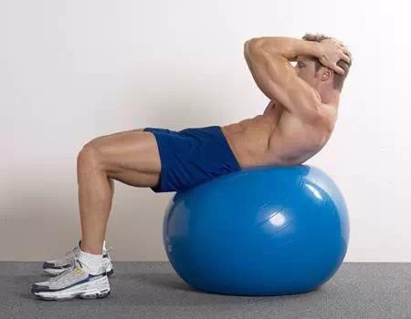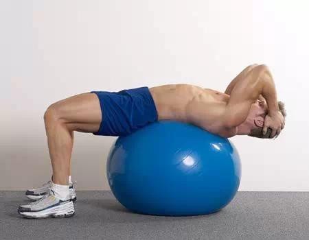 初始姿势:坐在健身球上,缓缓的将双脚向前移动,身体慢慢直到舒服的靠在健身球上,双脚分开与肩同宽,双手放在头部侧面。