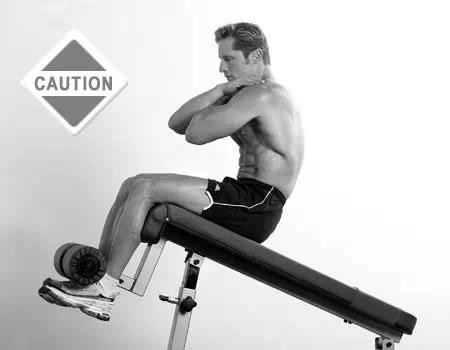 动作过程:缓缓卷腹使胸部靠近大腿,在顶峰收缩腹肌,然后缓缓回到起始位置,注意千万不要超越躯干垂直板凳的位置。双目凝视膝盖位置。