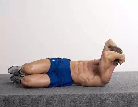这是基本卷腹的一个变化形式,变化体现在腿部位置(一条腿交叉放在另一条腿上),可以增加腹外斜肌的挤压程度。
