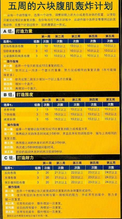 斯坦·麦奎 五周腹肌训练计划 该训练计划把动作分为三种:增加力量;增加围度和增加耐力