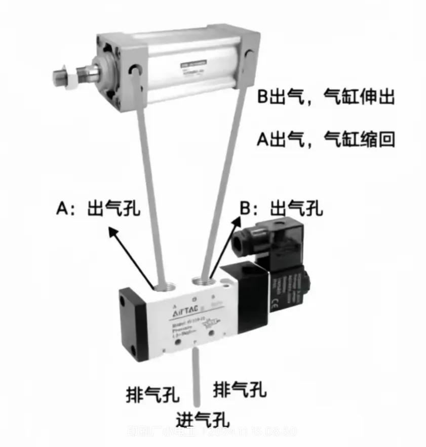 下图所示就是一个典型的两位5通电磁阀的应用。当气缸前端进气孔进气,后端必须要出气,这个时候气缸缩回。当气缸的后端进气,前端必须要出气,这个时候气缸伸出有进气就得有排气如果排气堵住这个气缸也是不会动作的。