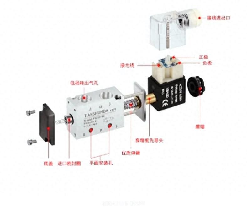 下图所示。就是我们常见的两位五通电磁阀,它主要是包括线圈插座、线圈、先导头、弹簧、阀体、底盖里面还有一个阀芯主要是由这几部分组成。
