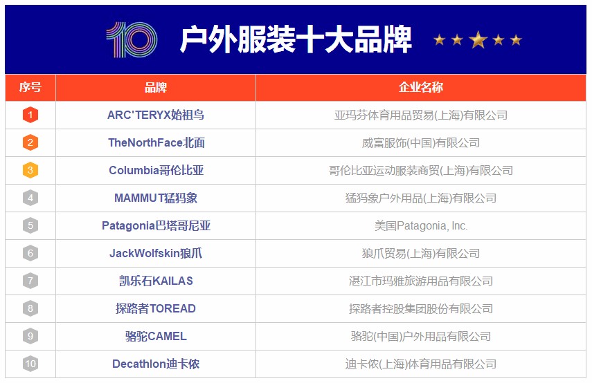 户外服装不同于普通服装,它是由多种含有特殊成分的服装面料制作而成,其性能要满足户外一些特殊要求,比如说保暖、透气性、防水、防风、耐磨等等。那么户外服装什么牌子好?下面,小编为大家分享户外服装十大品牌排行榜,包括ARC'TERYX始祖鸟、TheNorthFace北面、Columbia哥伦比亚、MAMMUT猛犸象、Patagonia巴塔哥尼亚、JackWolfskin狼爪、凯乐石KAILAS、探路者TOREAD、骆驼CAMEL、Decathlon迪卡侬等。该榜单由CNPP品牌榜中榜大数据研究院和CN10排排榜技术研究院专业测评而得出,一起来了解下吧。