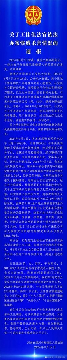 案件背景:事件发生在河南省漯河市郾城区。嫌犯党某某(50岁)因一起车祸索赔案对法院的裁决不满,进而对法官实施报复。党某某在一起轻度车祸事故中提起诉讼,要求被告赔偿约1万8800元人民币。然而,法官王佳佳(37岁)在7月23日的判决中,仅支持了9300元的赔偿金额。行凶过程:由于对裁决结果不满,党某某在8月7日持凶器进入王佳佳居住的小区地下车库,并在电梯口处刺死了王佳佳。警方接报后赶赴现场,发现王佳佳颈部被刀割伤,已无生命体征。通过查看相关录像,确认了行凶者身份。嫌犯抓捕:公安机关于8月8日在党某某家中将其抓获。当时党某某已畏罪服毒,处于昏迷状态。经过送医治疗,目前已无生命危险。后续处理:案件仍在进一步侦办中。郾城区人民法院对王佳佳的不幸遇害表示沉痛哀悼,并对其家属表示深切慰问。同时,对杀害办案法官的犯罪行为表示极大愤慨和强烈谴责。受害者情况:王佳佳是漯河市郾城区人民法院立案庭副庭长、一级法官,今年37岁,是家中的独生女,有一个正在读小学的儿子。