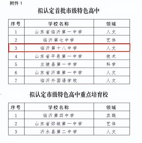 根据《临沂市教育局关于做好首批市级特色高中和第二批市级普通高中学科基地遴选工作的通知》精神,经学校申报、县区推荐、专家评审,临沂第十八中学顺利被评为临沂市首批市级特色高中。这一荣誉的取得是学校党委、校长室的坚强领导,申报工作小组精心组织,全体师生共同努力的结晶,希望十八中全体师生携手同行,潜心教书、静心育人,为建设省级特色高中接续奋斗!