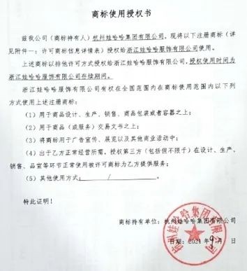 杭州娃哈哈服饰有限公司杭州分公司客服人员向记者出示了一份商标使用授权书。其内容显示,杭州娃哈哈集团有限公司于2021年9月授权杭州娃哈哈服饰有限公司使用商标用于商品设计、生产、销售等环节。