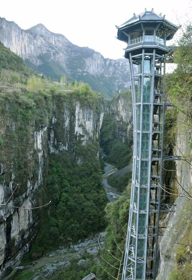 正在建设的恩施大峡谷云龙地缝观光电梯,外形酷似“小蛮腰”。,总投资约3500万元,观光电梯为纯钢结构,建筑高度130.1米,载重量为1600千克,运行速度2.5米/秒,单程运行时间为50秒。