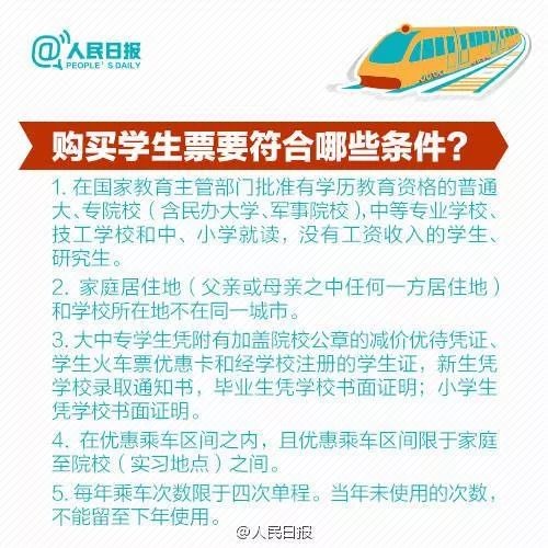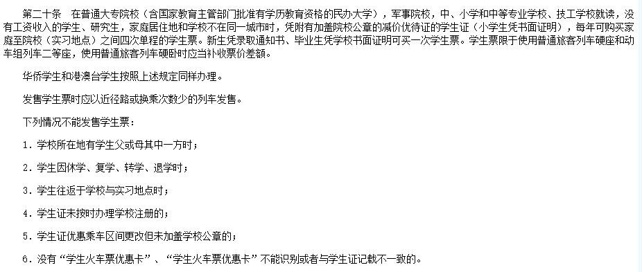 学生凭附有加盖院校公章的减价优待证的学生证,每年可购买家庭至院校之间四次单程的学生票。学生证未按时办理学校注册,学生证优惠乘车区间“更改”但未加盖学校公章等情况不能发售学生票。