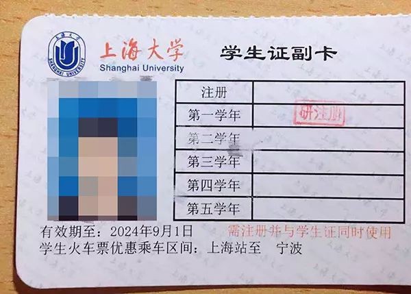 与部分高校纸质的学生证有所不同,上海大学的学生证由主卡、副卡构成,主卡类似电子校园卡,方便学生日常在校园就餐、进出图书馆等情况下使用,主卡上印着一个红色的学校公章;副卡则是一张纸质卡片,一面为学生每学年注册时盖章使用,一面贴着“火车票学生优惠卡”,还注明了每个人的优惠乘车区间,以及有效期。