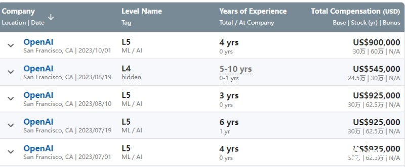 随着ChatGPT的爆火,OpenAI公司也成为了外界关注的焦点。根据美国薪资跟踪网站的数据显示,目前OpenAI软件工程师的中位数年薪高达92.5万美元,包含了30万美元的基本工资和62.5万美元的利润参与单位(PPU)。