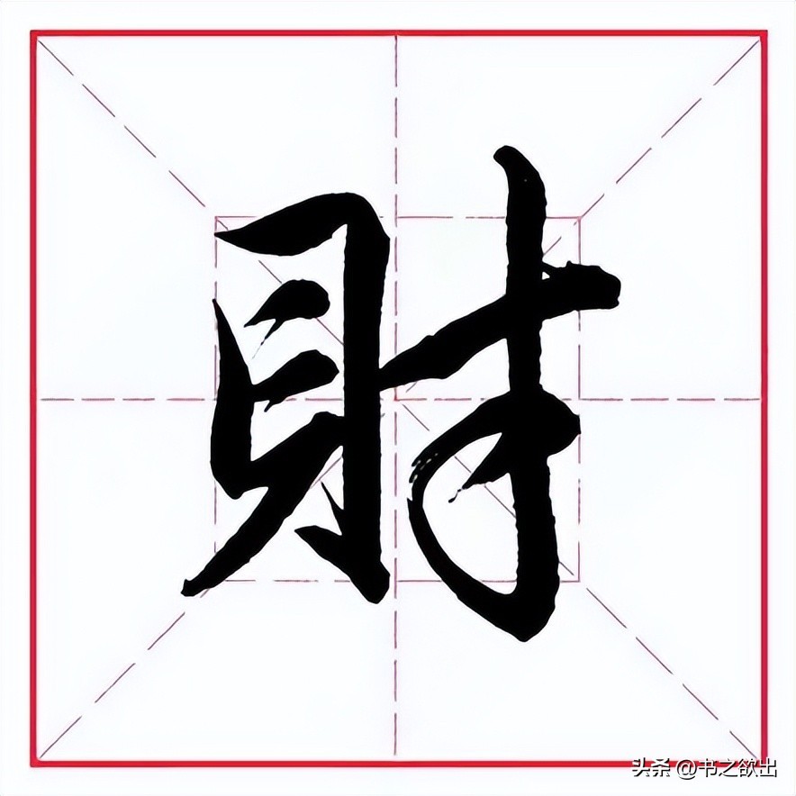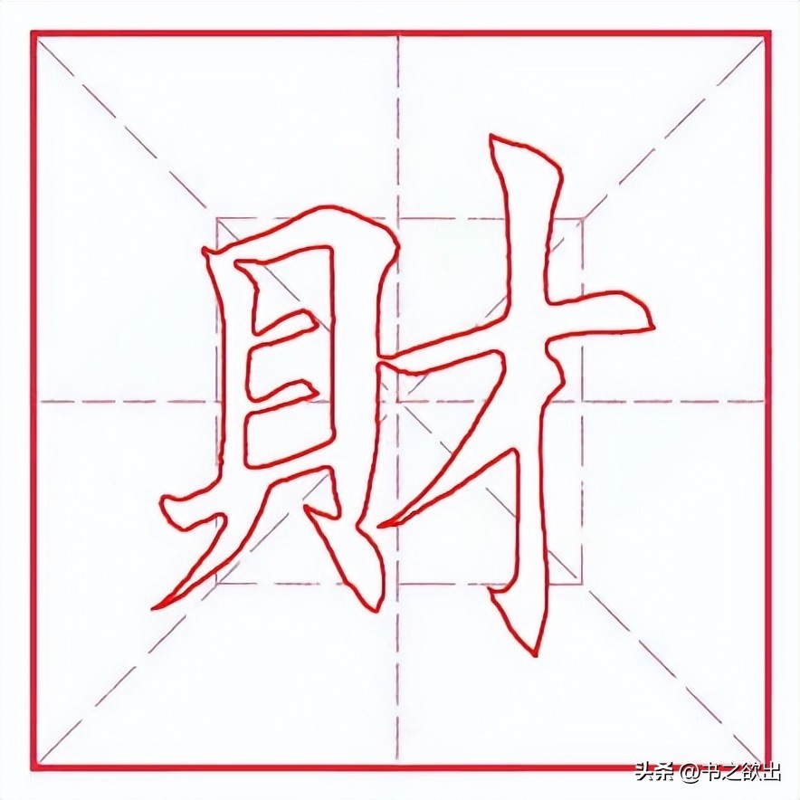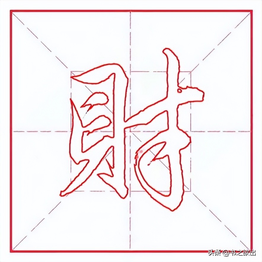左边“貝”字旁斜势抗肩,左伸右收,不要写宽。左竖斜切起笔,稍重,向下行笔略轻,稍左斜;横折与左竖虚接起笔,横画勿重,抗肩,行笔到位后向上稍抬笔锋然后顿笔向下内擫写右竖,竖身稍重,稍长,与左竖略呈相背之势;里面两个小横抗肩角度一致,不要写重,间距相等;底横起笔左探,向右抗肩上行,托住左竖,与上面横画平行等距,收笔藏于右竖;下面“八”字撇笔位置靠左,注意弯度,勿重;点笔略长,重心与右竖对应。