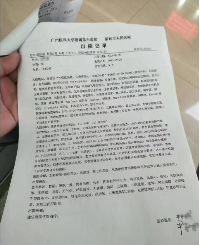 家人将孩子送到医院检查后才发现,孩子脑部出血严重,医生甚至发了病危通知书。医院采取了保守治疗,但孩子的病情没有明显好转。最终,孩子被转院至广州市珠江医院,接受了微创手术,但右腿的灵活性受损,存在后遗症。