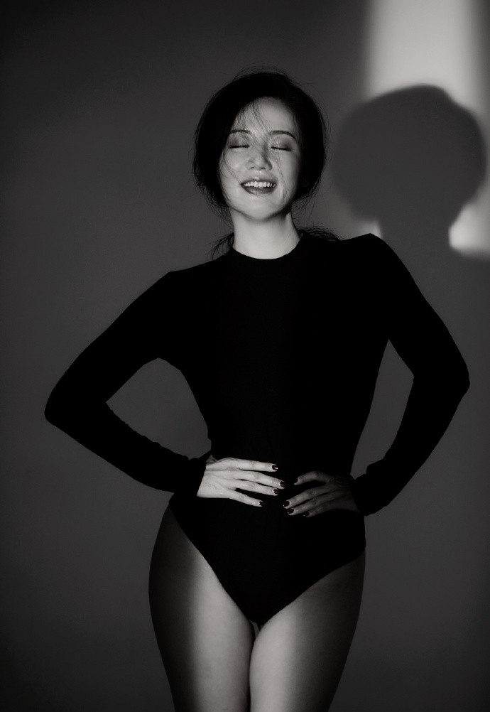 照片中的张彤坐在白色的方形石膏上凹造型,摆手弄姿十分撩人,黑白的光线让肌肤更加白皙,又性感又有艺术氛围。