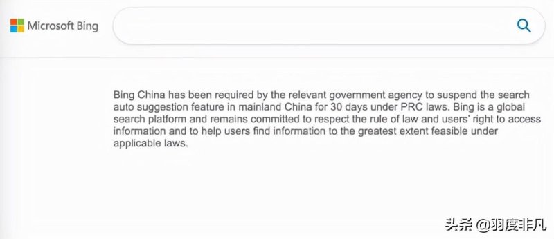 微软官方对于“Bing搜索在中国内地无法使用”也发布了公告,公告称“根据中国法律,Bing China已被相关政府机构要求在中国大陆暂停搜索自动建议功能 30 天。”
