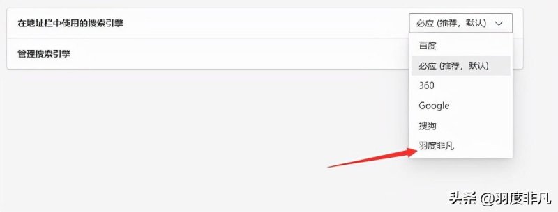 如果在下拉菜单中没有找到你想要使用的默认搜索引擎,可以在下面的“管理搜索引擎”中,自己添加对应搜索引擎的网址。