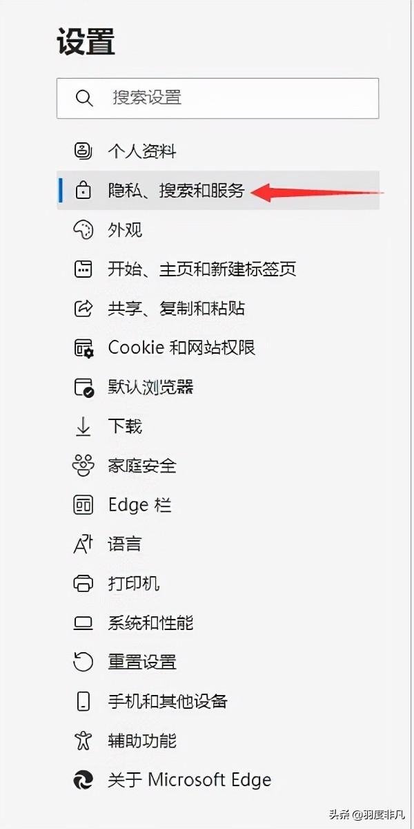 2.在“设置”页面的左侧菜单中,选择“隐私、搜索和服务”