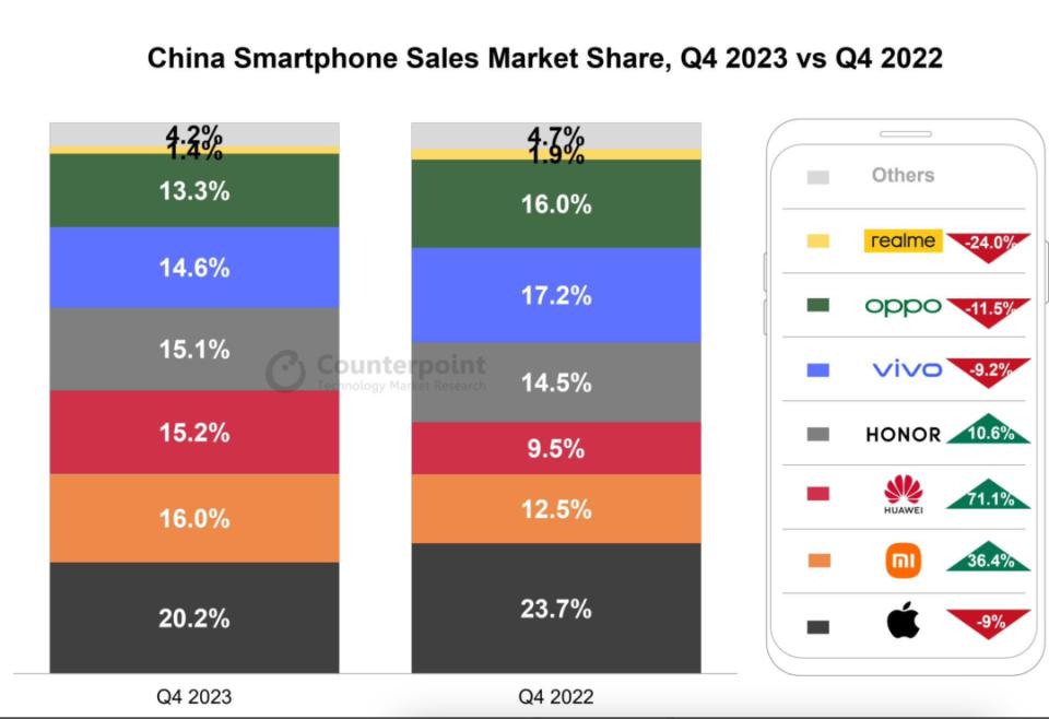 具体品牌方面,华为凭借自己的 5G 芯片卷土重来,继续吸引消费者,而小米和 HONOR 则保持两位数增长,表现强劲。