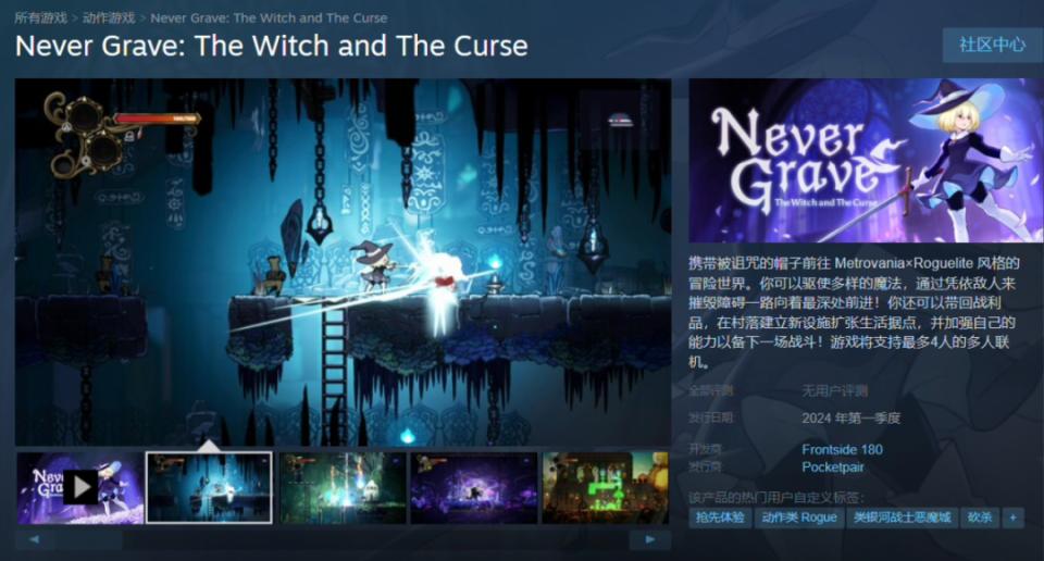 POCKET PAIR 的又一款 " 缝合 " 游戏要来了,新作《Never Grave: The Witch and The Curse(永不坟墓:女巫与诅咒)》现已在 Steam 开启抢先体验,放出了试玩 Demo,将于 2024 年第一季度发售。