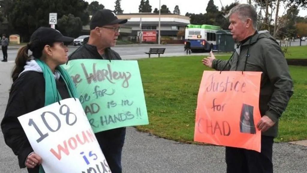 肖恩 · 奥梅利亚(右)在周二对布林 · 斯佩彻宣判前一天举行的示威活动中与其他抗议者聊天。布林 · 斯佩彻因杀害奥梅利亚的儿子查德而被判过失杀人罪。(汤姆 · 基斯肯 / 明星 / 今日美国网络)