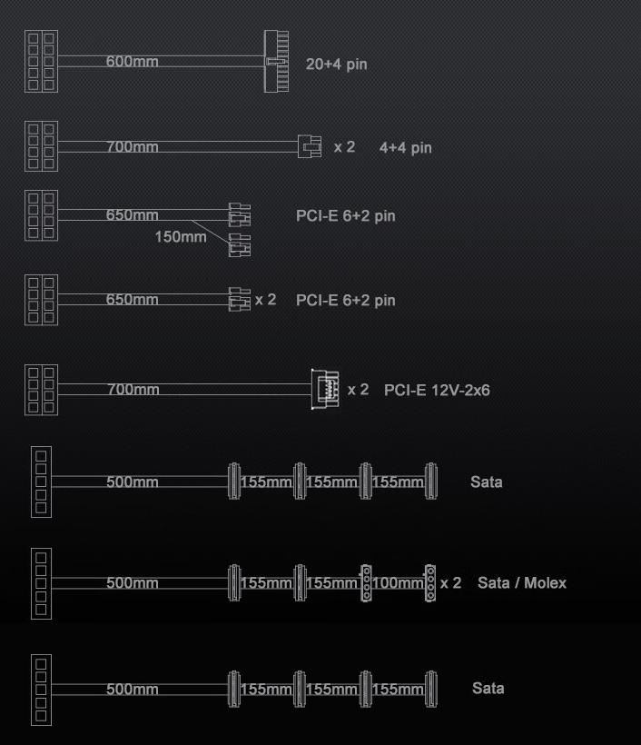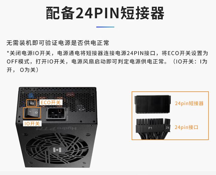 接口方面,这款电源配备 PCl-e 5.1(12V-2x6)接口,配套 12Pin+4Pin 线材;并配有 24PIN 短接器,无需装机即可验证电源是否供电正常。