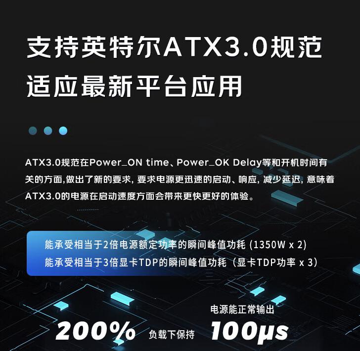 性能方面,这款电源经过 80Plus 白金牌认证,转换效率 92%,采用日系 105°C 工业等级电解电容,支持英特尔 ATX3.0 规范,能承受相当于 2 倍电源额定功率的瞬间峰值功耗(1350W x 2)及相当于 3 倍显卡 TDP 的瞬间峰值功耗(显卡 TDP 功率 x3)。