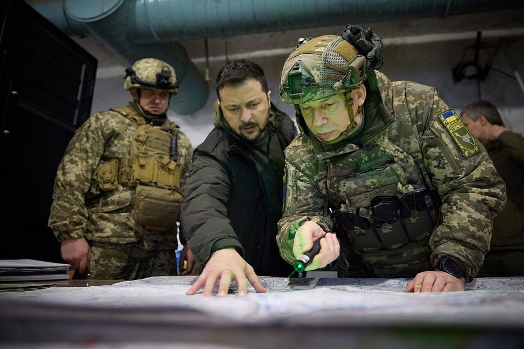 2023 年 11 月 30 日,乌克兰总统泽连斯基和瑟尔斯基(手持激光笔者)在哈尔科夫地区库皮扬斯克的前线指挥部。