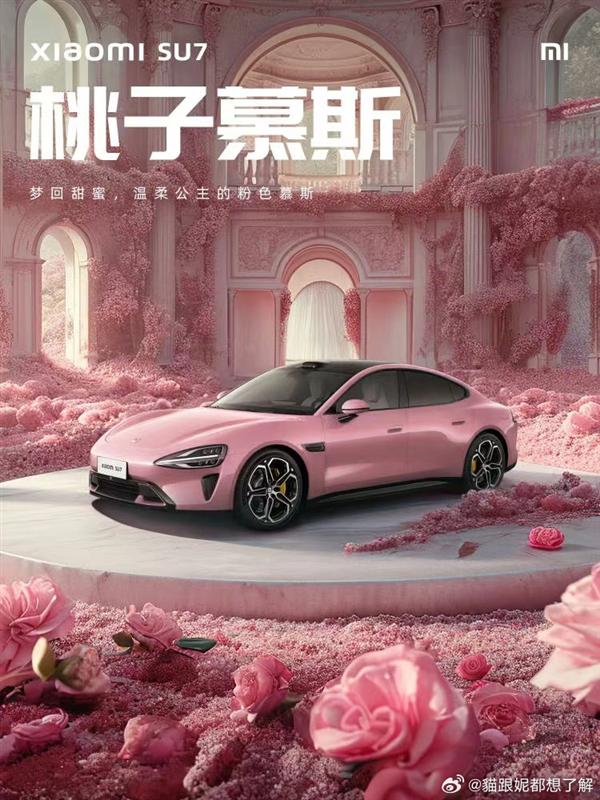 据了解,这张图出自网友自行设计的小米汽车 SU7 配色,除了粉色外,还有白色、红色、金色、银色等等。