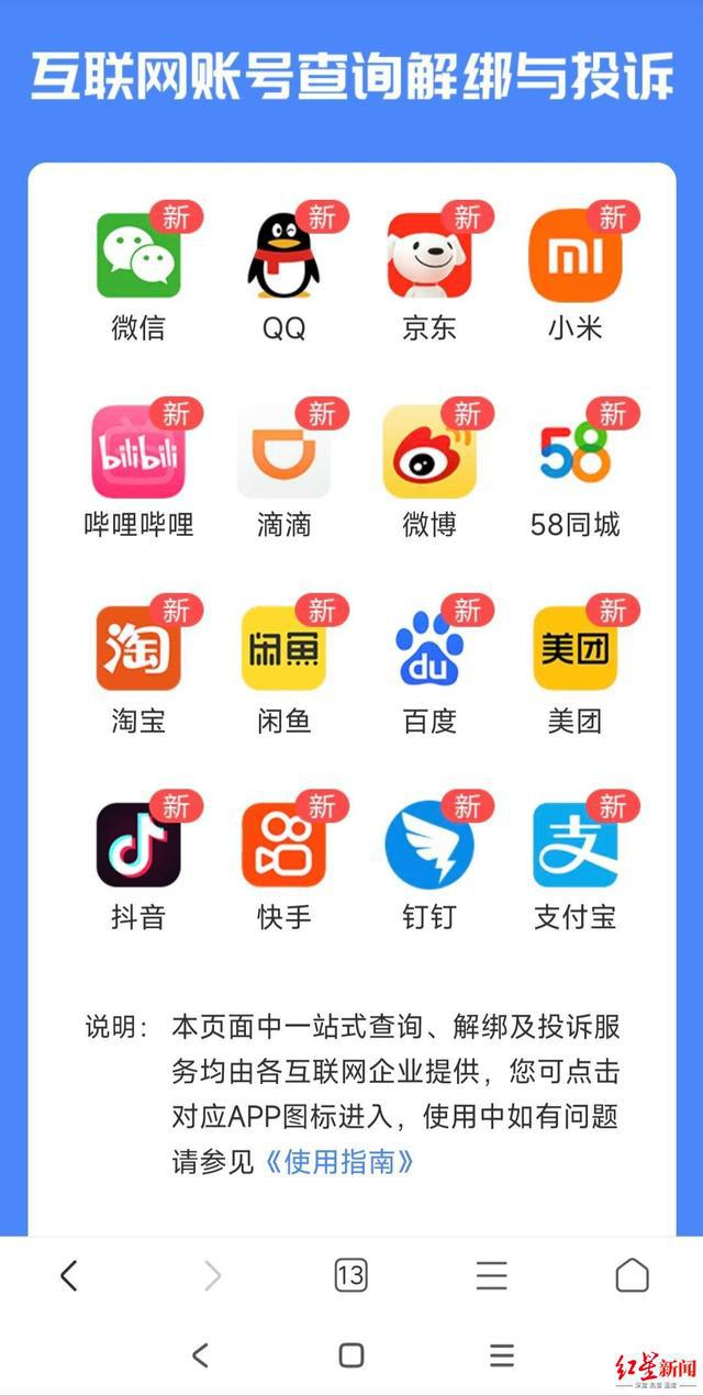 红星新闻看到,目前," 互联网账号查询解绑与投诉 " 页面下共集纳了包括微信、QQ、京东、淘宝、支付宝、百度、快手、抖音、美团等 16 个图标。用户如需解除手机号与平台账号的绑定,需点击图标跳转至平台进一步操作,提交相关信息才能完成。
