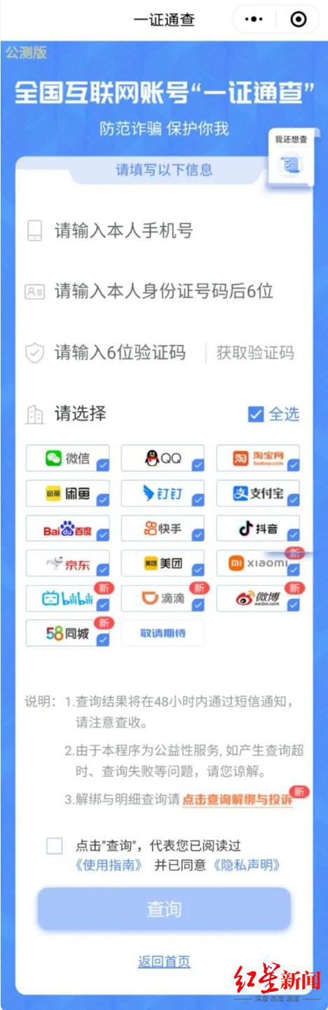 ▲全国互联网账号 " 一证通查 " 页面