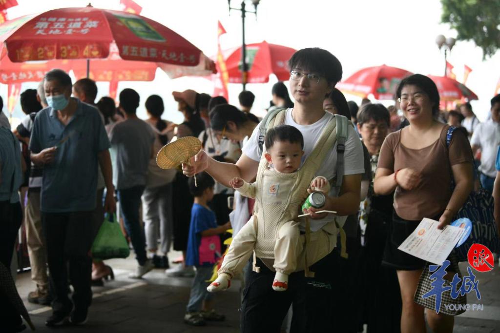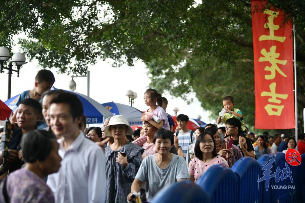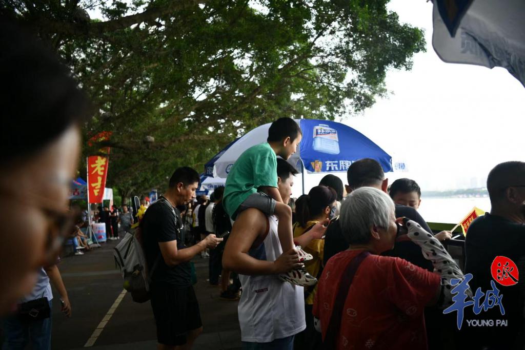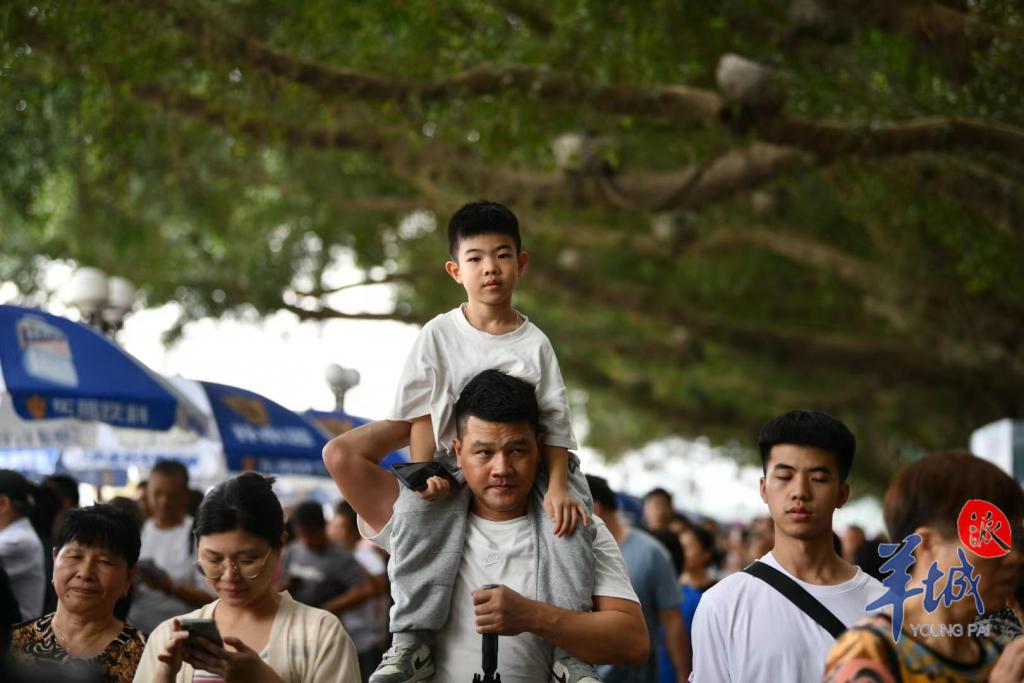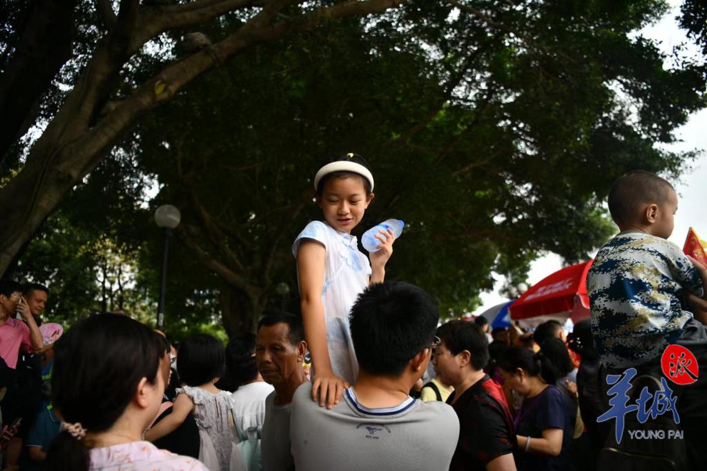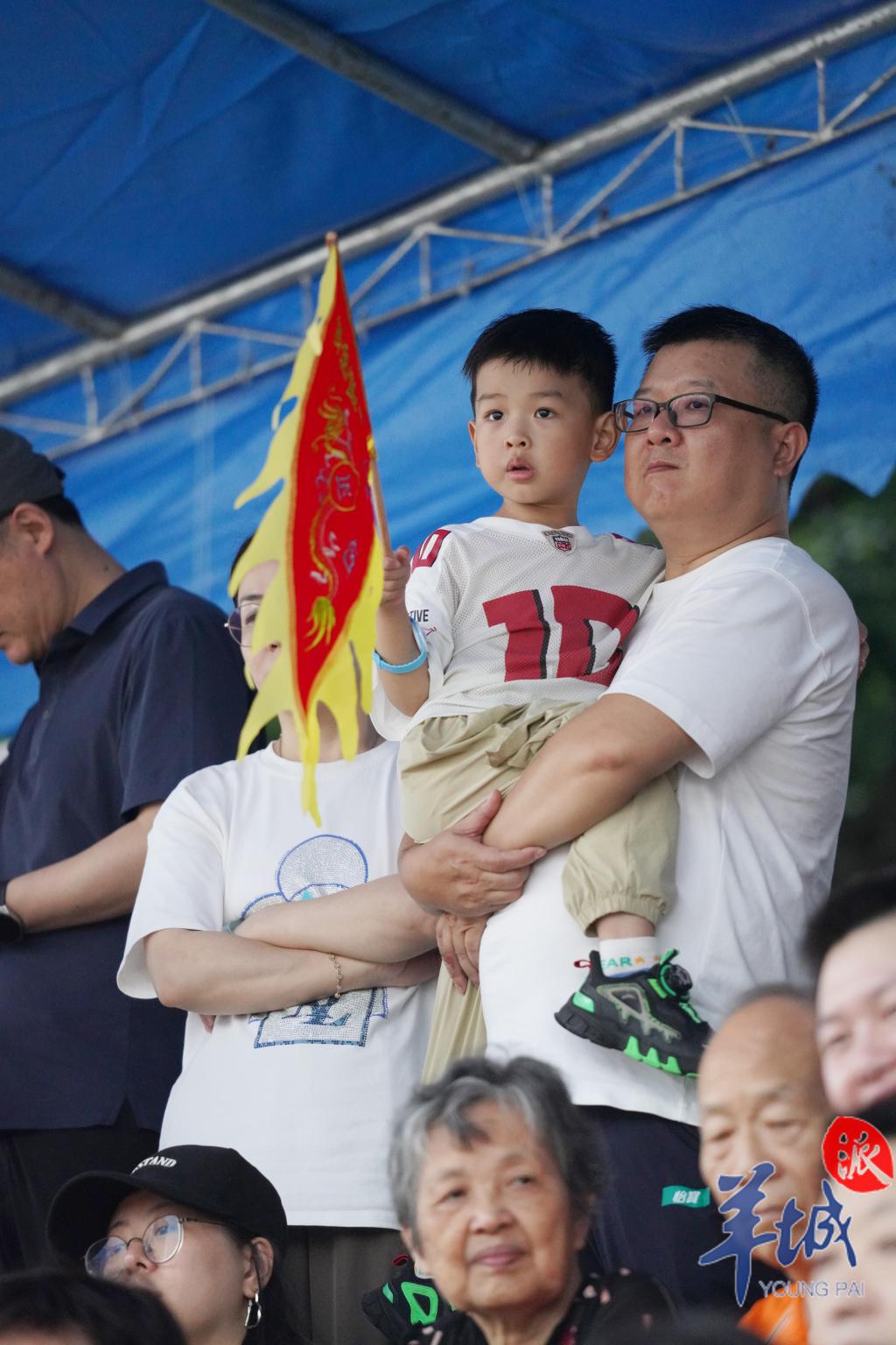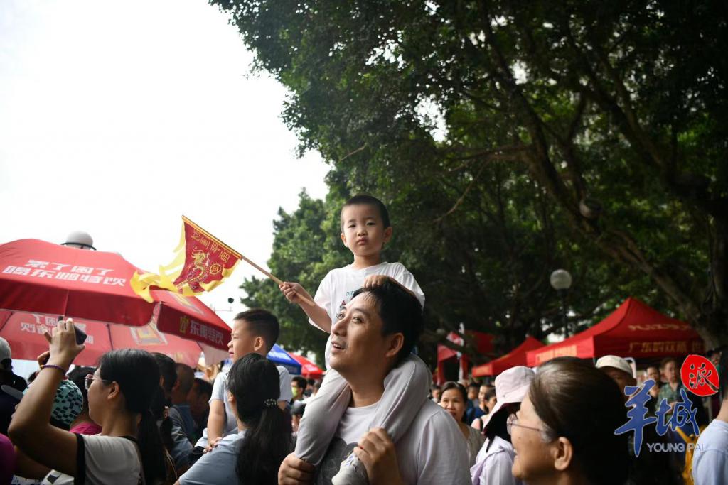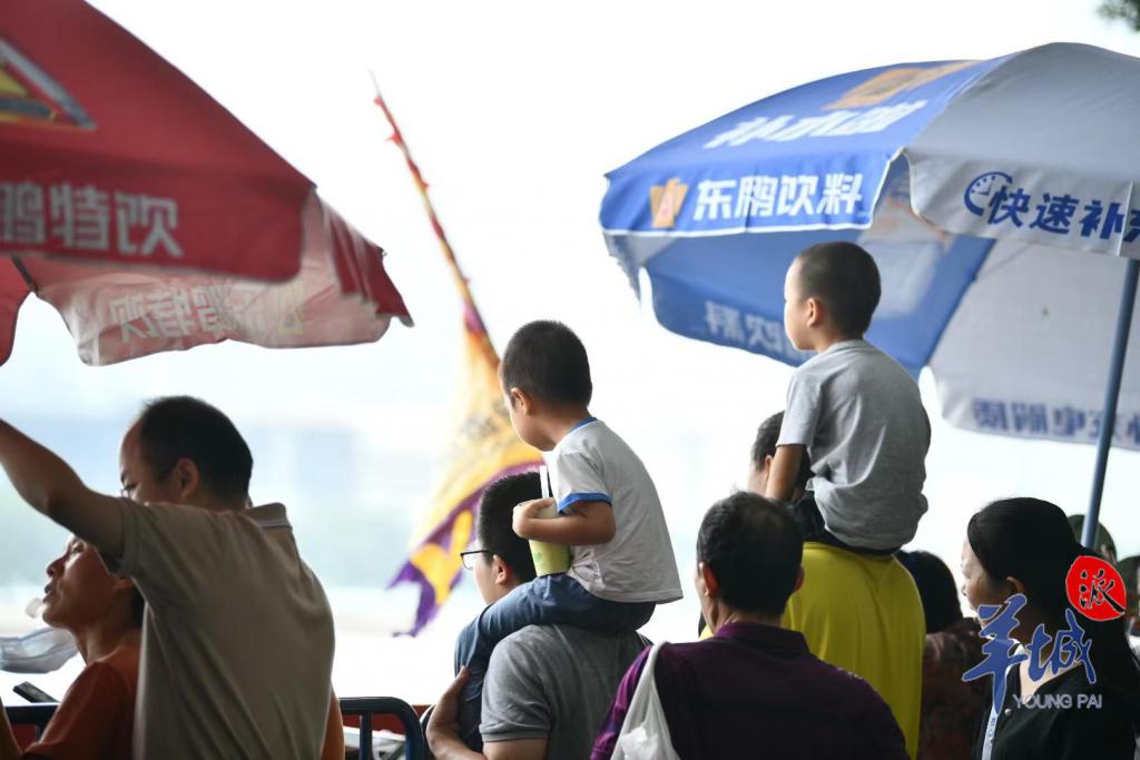 珠江两岸挤满了前来观赛的市民们,里三层外三层,全家人齐上阵。小朋友们坐上了父亲的肩头,以 " 绝佳视角 " 观赏这一盛事。江面上锣鼓喧天、百舸争流,团结奋进的精神力量激荡在珠江上空,而沉稳厚重的父爱,也在千层水波旁,浓浓化开。