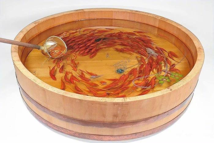 虽然现如今有大量的同类产品出现在某宝上,但是深堀隆介却是树脂金鱼画技法的创造者。之所以会画金鱼,根据深堀隆介自述,当他正挣扎著探索他的艺术视野时,他饲养了超过7年的宠物金鱼成为了他的灵感来源。 同时也给予他生命的热情和创作的主题:“如此美丽之物,都能在污浊的环境中生存,并一直等待着能发现她美丽的人,我又为何不能?它一定是来救赎我的。”