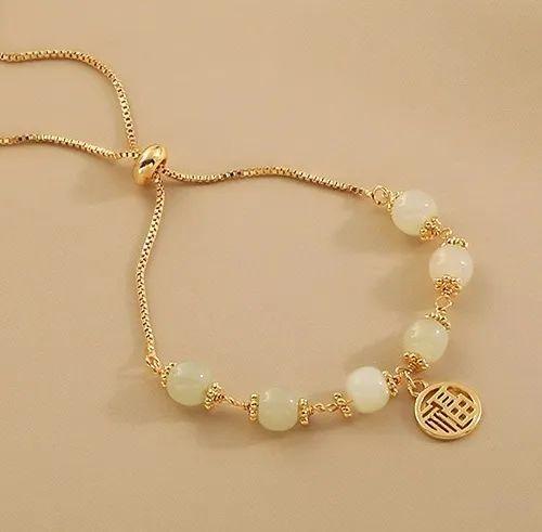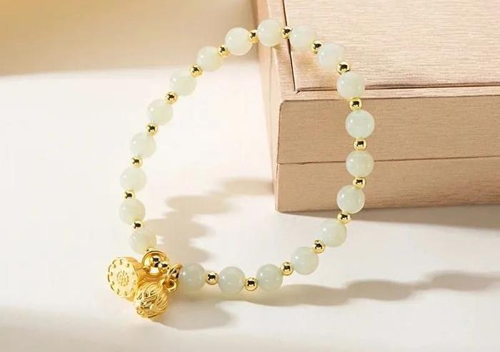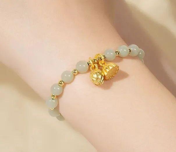 与玉珠中间的金色珠子相互呼应,整体造型颇有豆蔻年华的灵动和秀丽之感。