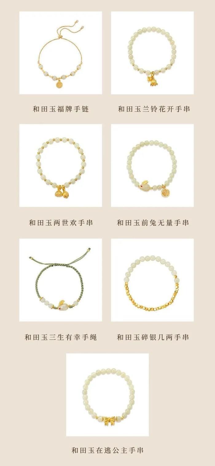 分别为:福牌手链、三生有幸手绳、碎银几两手串、前兔无量手串、在逃公主手串、两世欢手串、铃花开手串。
