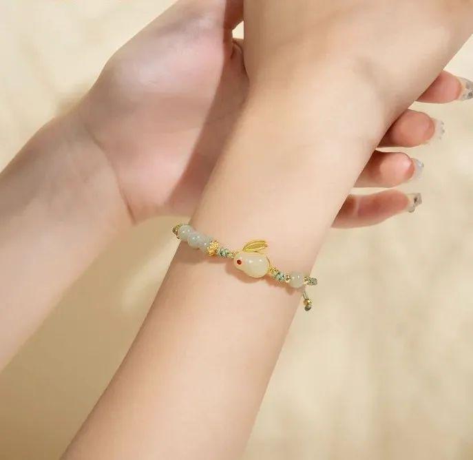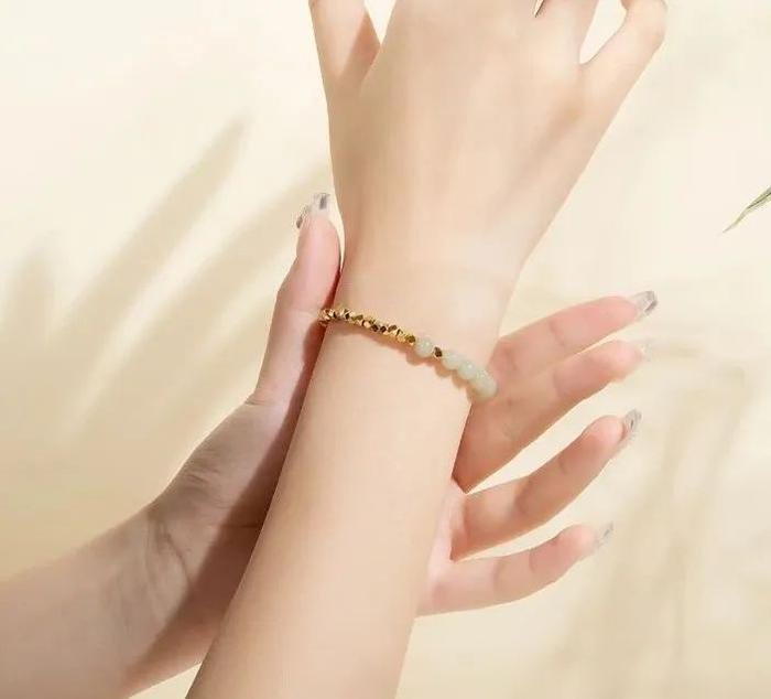 一颗颗晶莹剔透,温润如酥的和田玉珠,戴在纤纤皓腕间,如星光点点盘踞,自成风景。