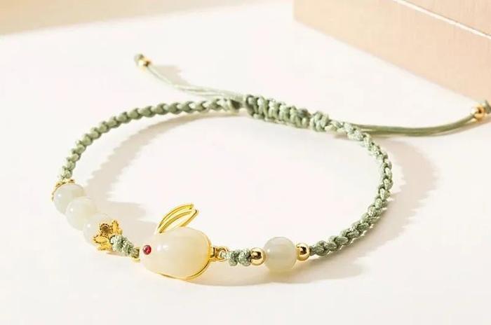 当古香古色的和田玉石配上,水绿色的手绳,中间的几颗小珠子,像晨间绿叶上的露珠,水润清雅。
