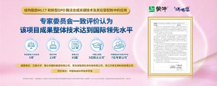 在“十四五”国家重点研发计划的支持下,由蒙牛瑞哺恩联合江南大学等单位合作完成的“结构脂肪MLCT和新型OPO酶法合成关键技术及其在婴配粉中的应用”成果通过国家权威机构鉴定,获得来自中国食品科学技术学会的院士专家认可,刷新母乳研究新高度。