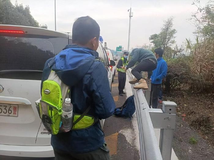 驴友天性爱登山冒险,但在高速上这可行不通。应超超急忙开展劝说工作,要求所有人站在隧道出口护栏外的安全地带就地等待。
