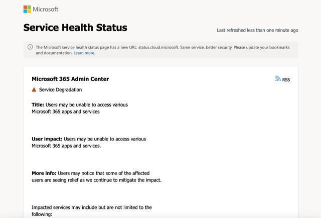 微软官网一条不断更新的服务健康状态显示,目前用户可能无法访问各种 Microsoft 365 应用和服务,微软称正在解决。