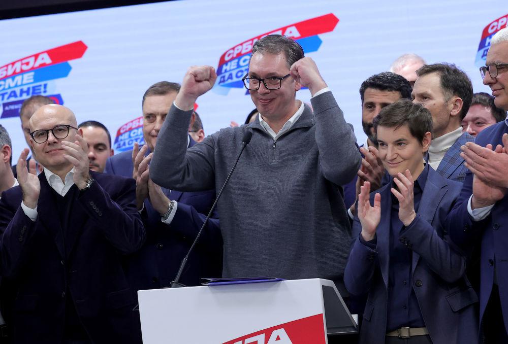 2023 年 12 月 17 日,塞尔维亚总统武契奇(中)在位于首都贝尔格莱德的塞尔维亚前进党总部发表讲话。图片来源:新华社