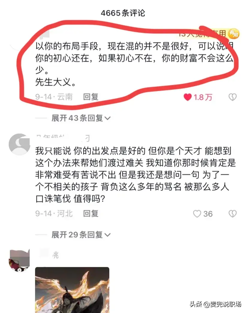 有网友称:以先生的布局手段,现在混的并不是很好,可以说明你的初心还在,如果你的初心不在,你的财富不会这么少。