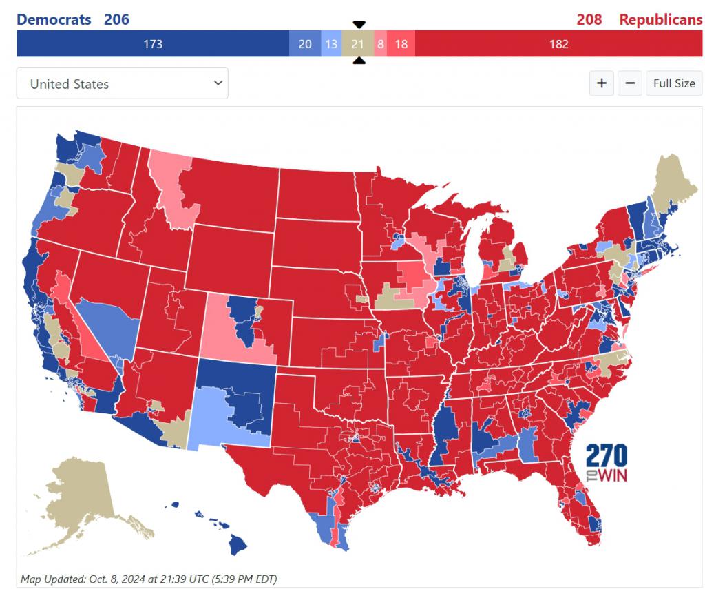 美国选举网站 "270towin" 的最新统计显示,在 435 席中,目前共和党与民主党比较确定能拿下的位置分别达到 182 席和 173 席。再加上具有一定领先位置的席位,共和党比较有机会能赢下来的席位有 208 席,民主党那一边则是 206 席。剩下还有 21 席处于完全混沌的状态。