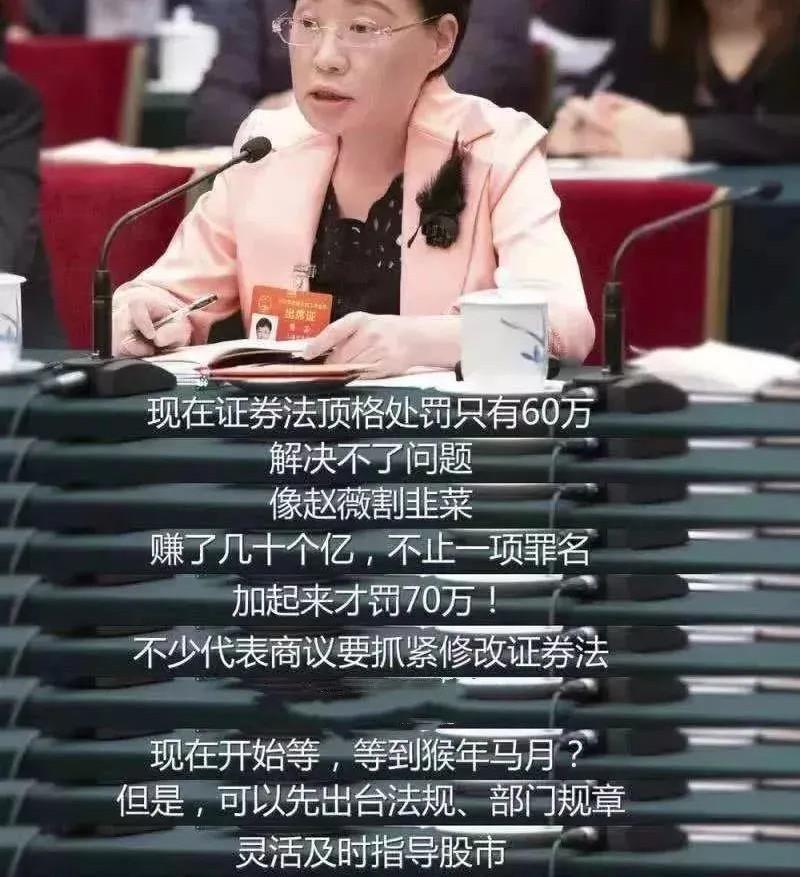 另一次会议上,一位代表还直接点名赵薇,直言不讳地表示:“证券法顶格处罚只有60万,已经证明解决不了问题,例如像赵薇割韭菜,赚了几十个亿,不止一项罪名,加起来,才罚了70万元”