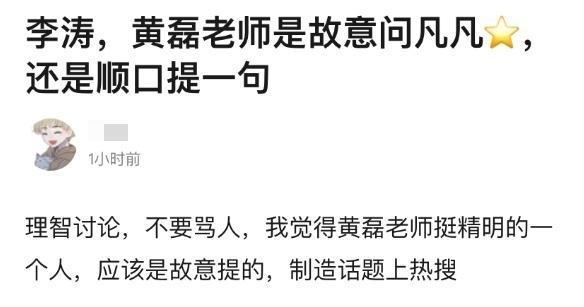 吴亦凡的粉丝就开始喷黄磊,明明吴亦凡和张艺兴有过节,黄磊怎么在吴亦凡面前提及张艺兴,有事吗?更有吴亦凡的粉丝阴谋论,黄磊这么一个老狐狸,应该是故意提张艺兴好让吴亦凡张艺兴上热搜炒热度。
