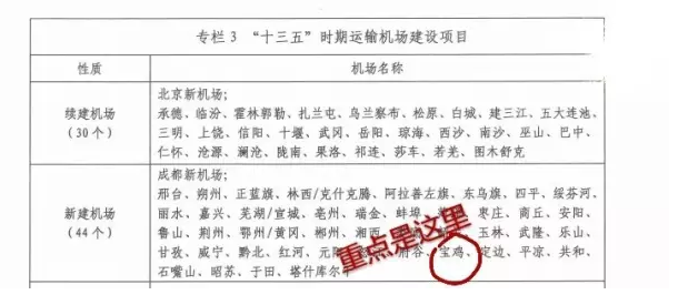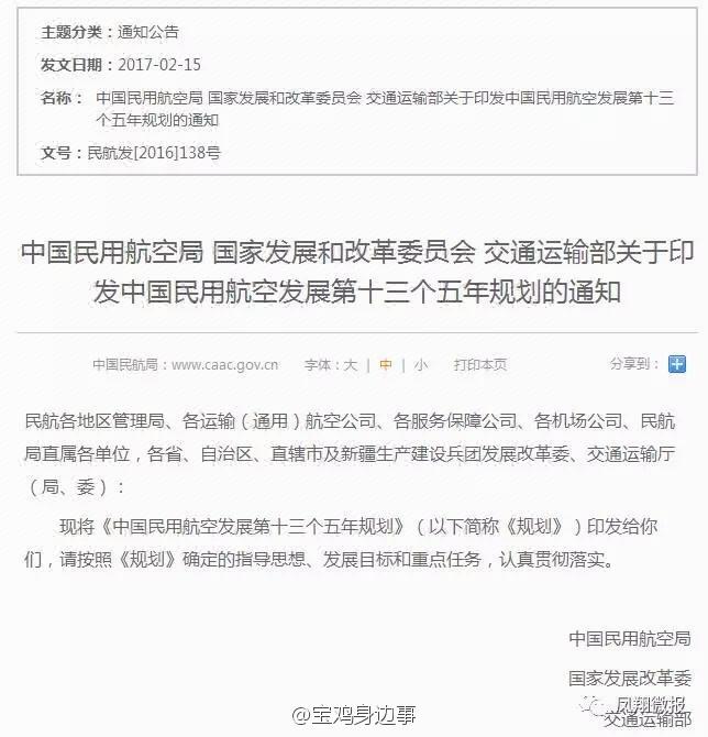 其中提到:宝鸡机场项目前期工作目前已完成,由于国家“十三五”机场规划还未正式发布,宝鸡机场建设目前在等待审批。
