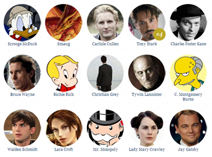 这份富豪榜的其他常客包括亿万富豪托尼·斯塔克《钢铁侠》、福斯特·凯恩《公民凯恩》、布鲁斯·韦恩《黑暗骑士》、泰温·兰尼斯特《权利的游戏》、劳拉·克劳馥《古墓丽影》、玛丽·克劳利《唐顿庄园》、杰·盖茨比《了不起的盖茨比》。