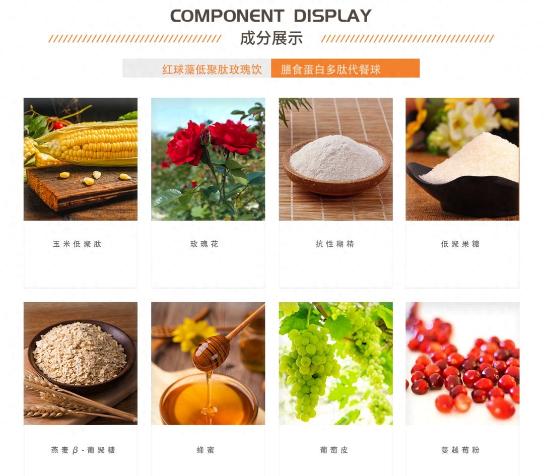 在“仟佰宠”红球藻低聚肽玫瑰饮产品的外包装盒上标明其成分为:水,抗性糊精,低聚果糖,低聚木糖,蔓越莓粉,玫瑰花,蜂蜜,奇亚籽,小蓟粉,燕麦β-葡萄糖,玉米低聚肽粉、决明子粉、氯化钠、魔芋粉、食品添加剂等。其营养成分表为,每100g中能量为224千焦,蛋白质为0.6g,脂肪为0,碳水化合物为12.6g,钠16毫克。