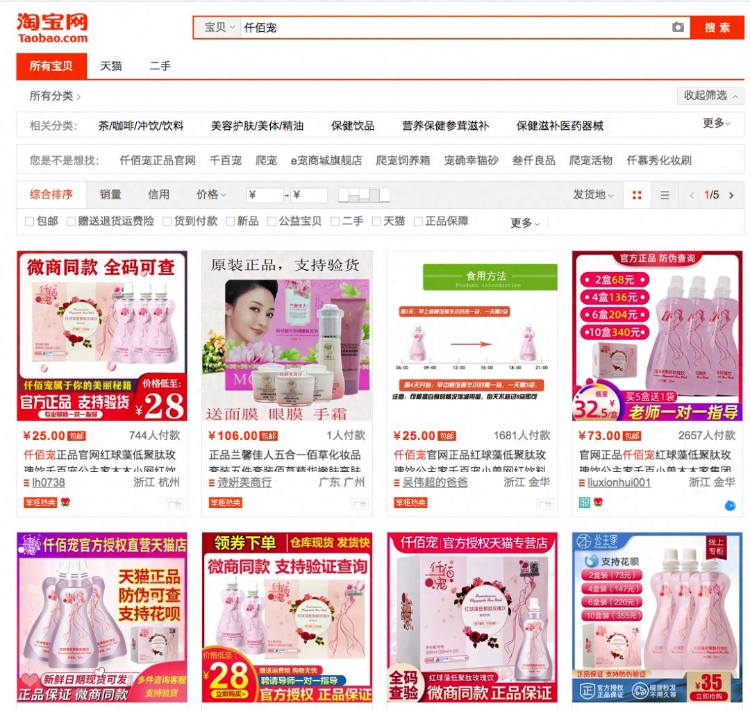 据了解,这款饮料只通过微信经销商(微商)渠道销售。但是在淘宝、京东等电商平台上检索该产品,发现很多店铺都有售。在淘宝平台一家“仟佰宠商城”的店铺中,产品图上明确写着:“微商同款,支持验货,公主家正品”。